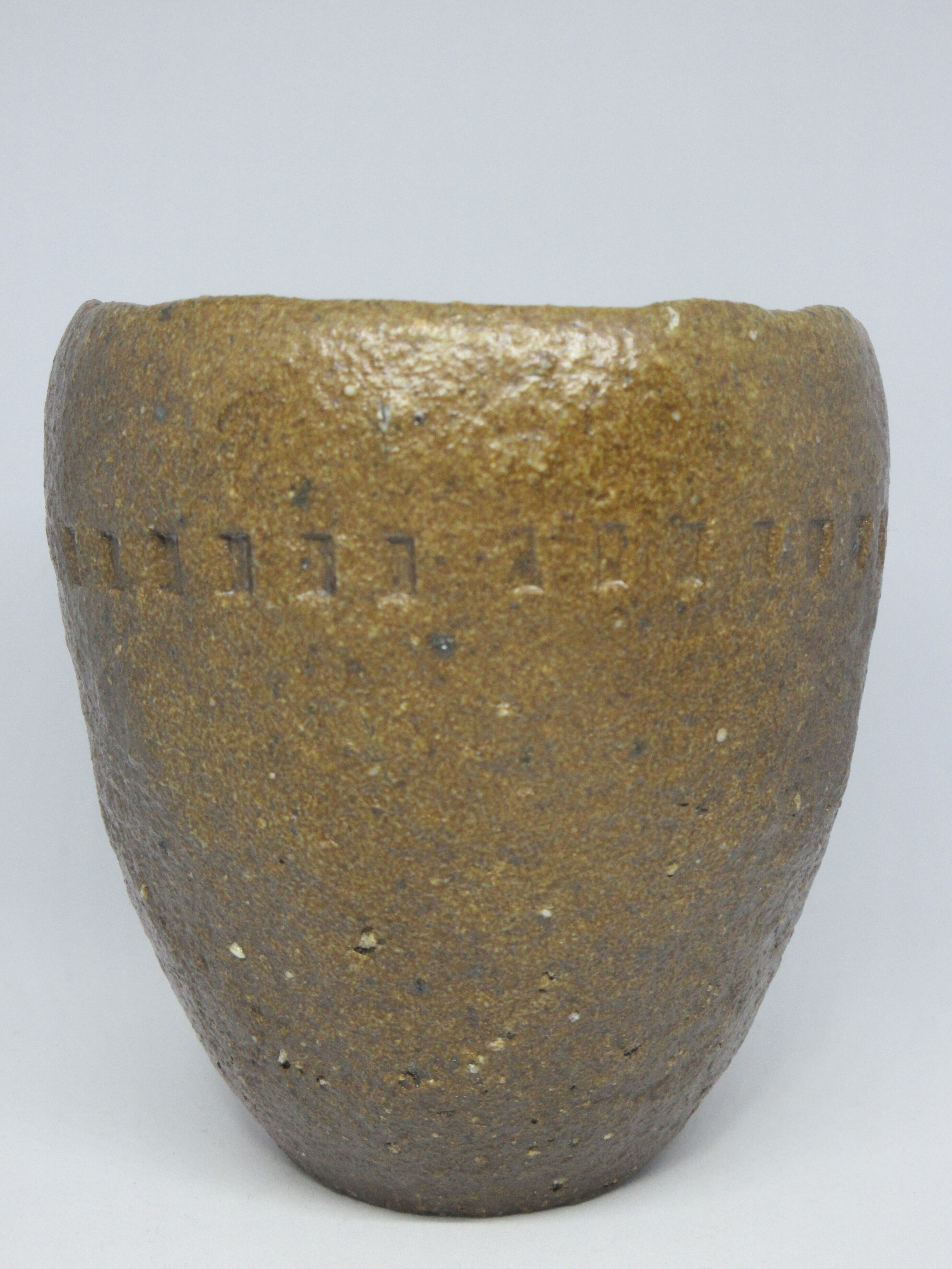 表面を石目に削られている、胡麻の景色の焼酎杯です。