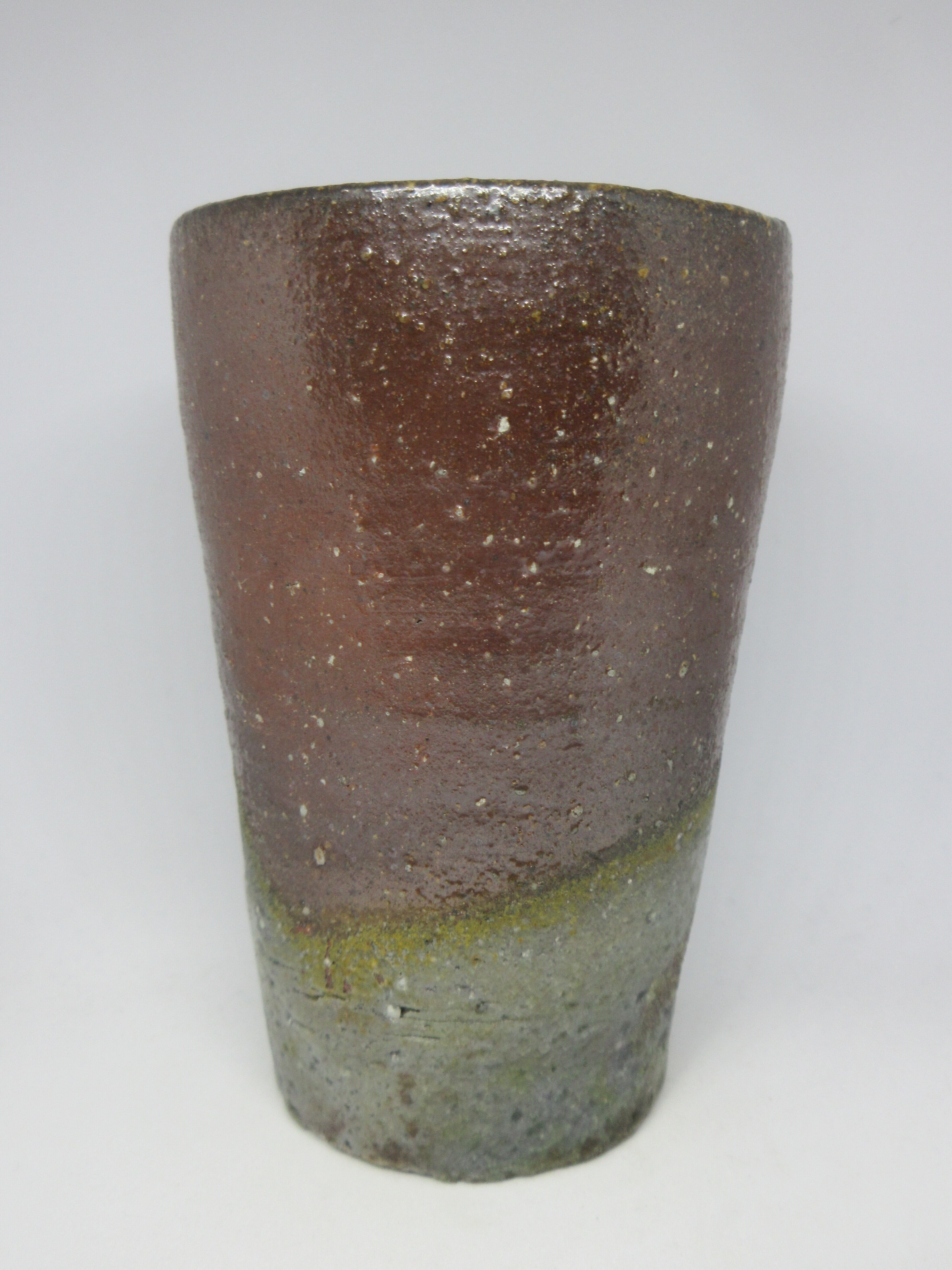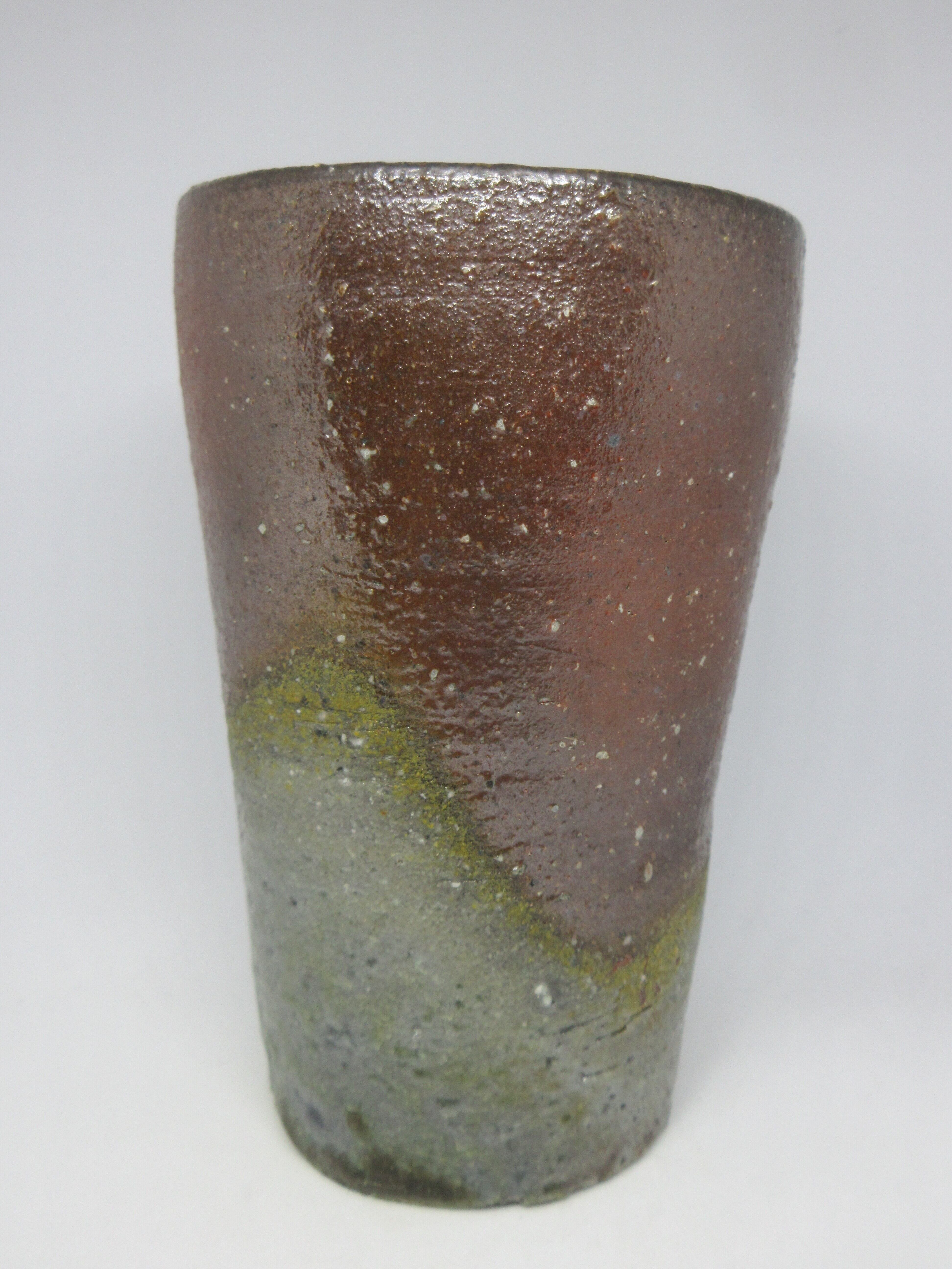 茶色の地肌に下部の灰色の窯変が特徴のビアマグです。