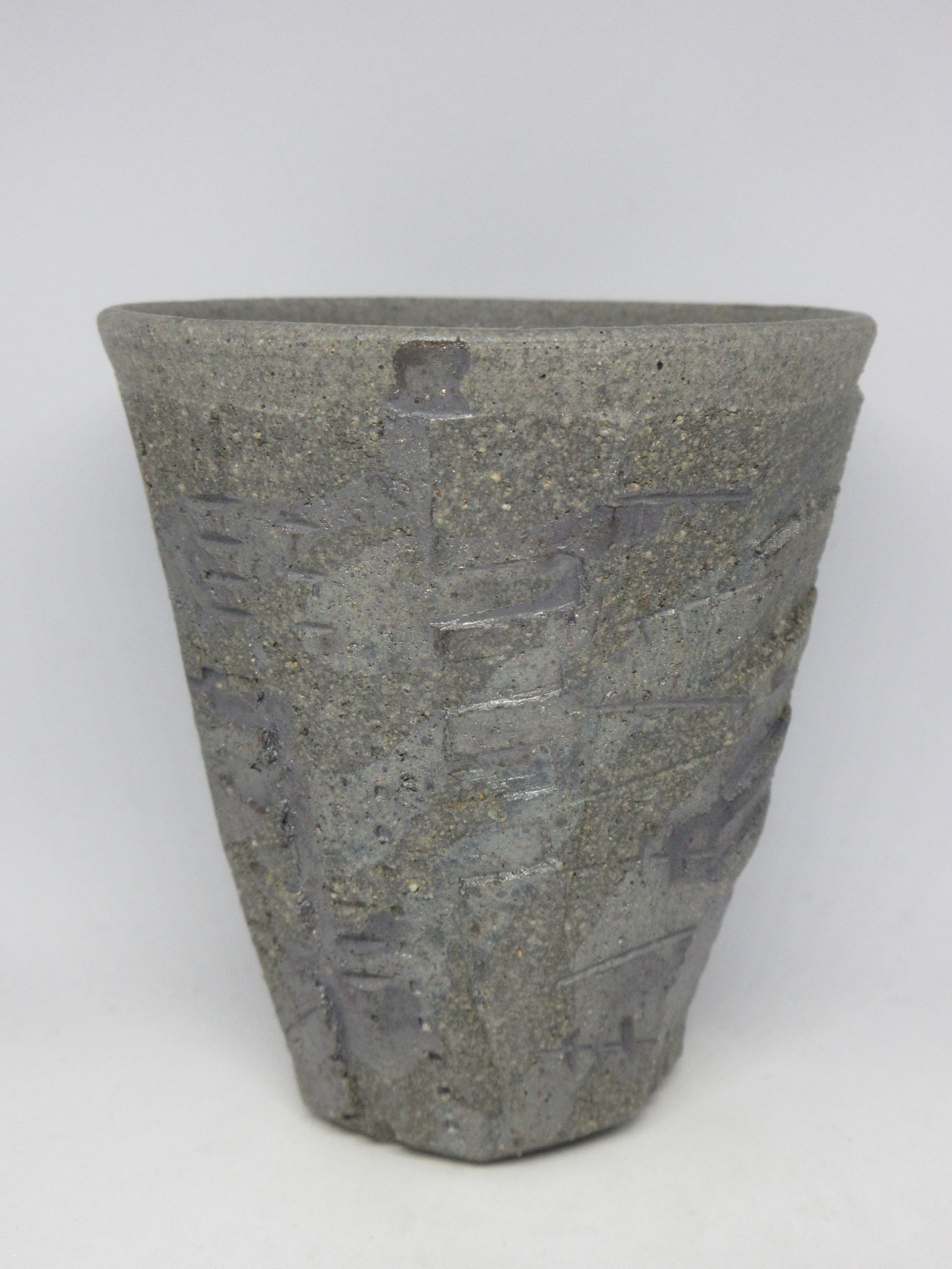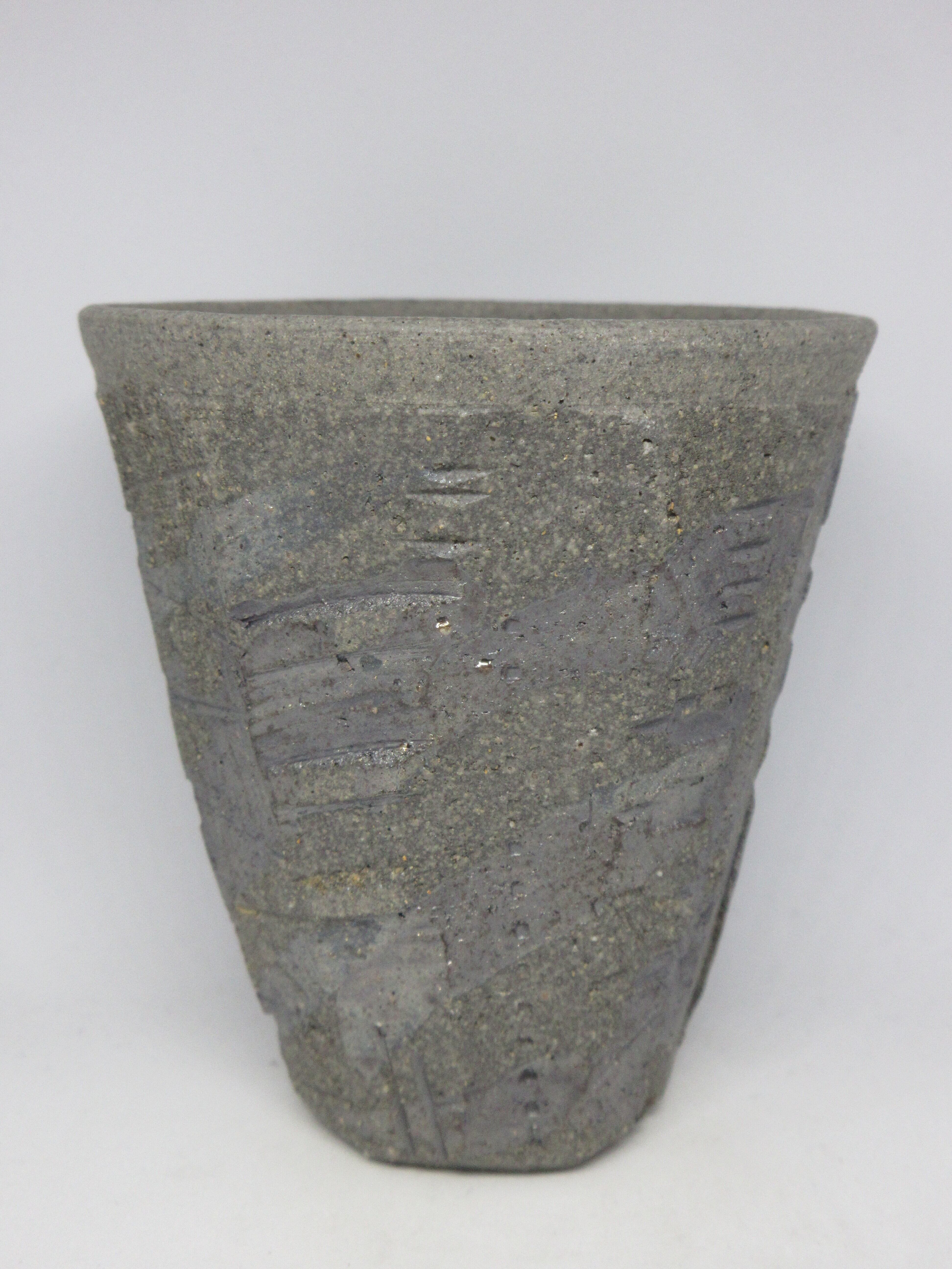 作者が自家精製した備前産ベンガラと一次粘土で化粧して冷却還元で焼成された青備前の杯です。鉄分の輝きが宇宙を感じさせる雰囲気です。