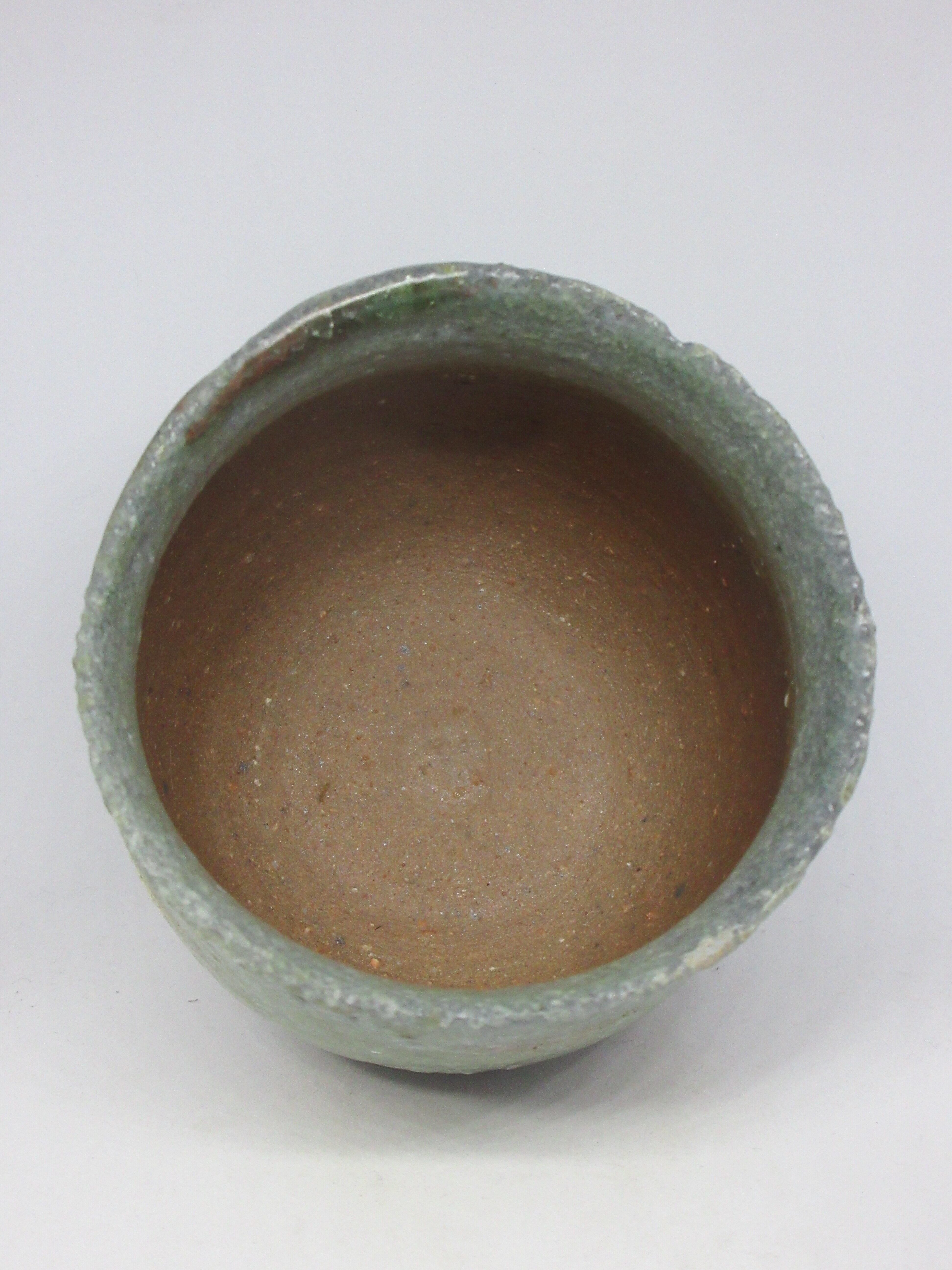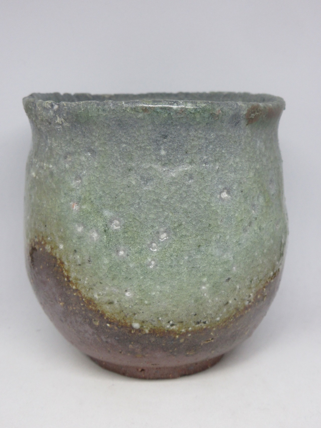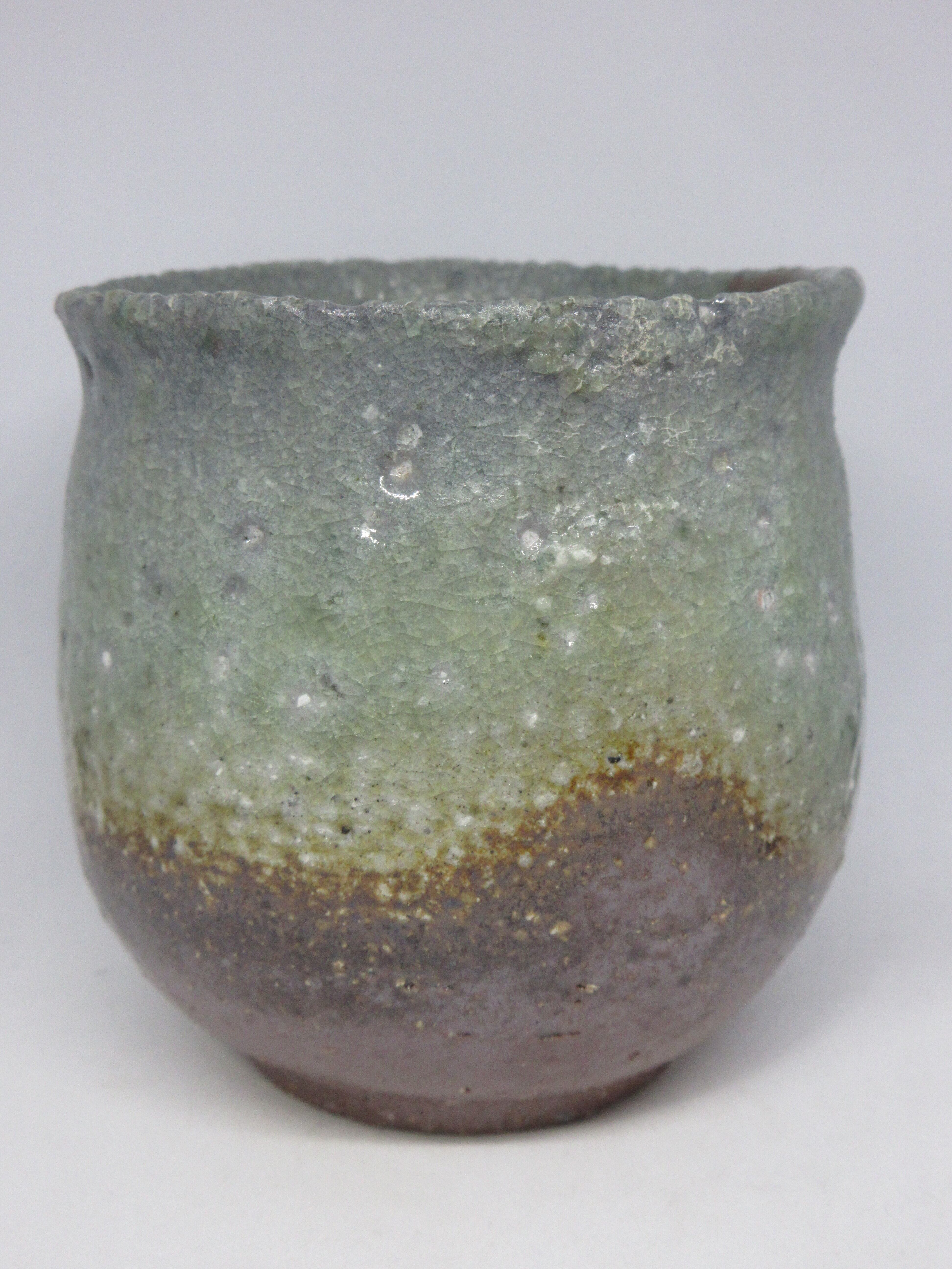 上部は碧く下部はレンガ色に焼きあがった作品です。大き目の湯呑で焼酎など、お酒を