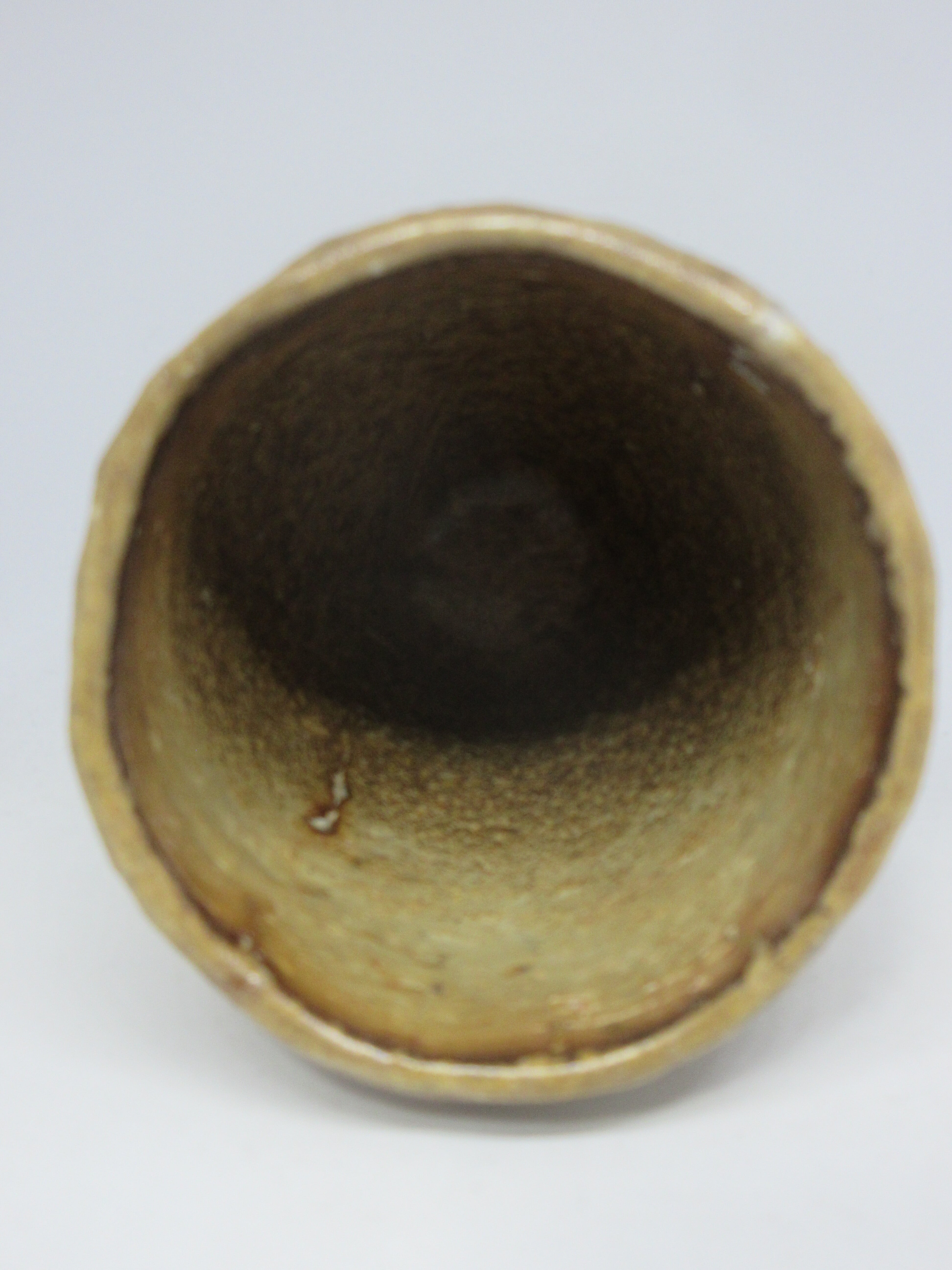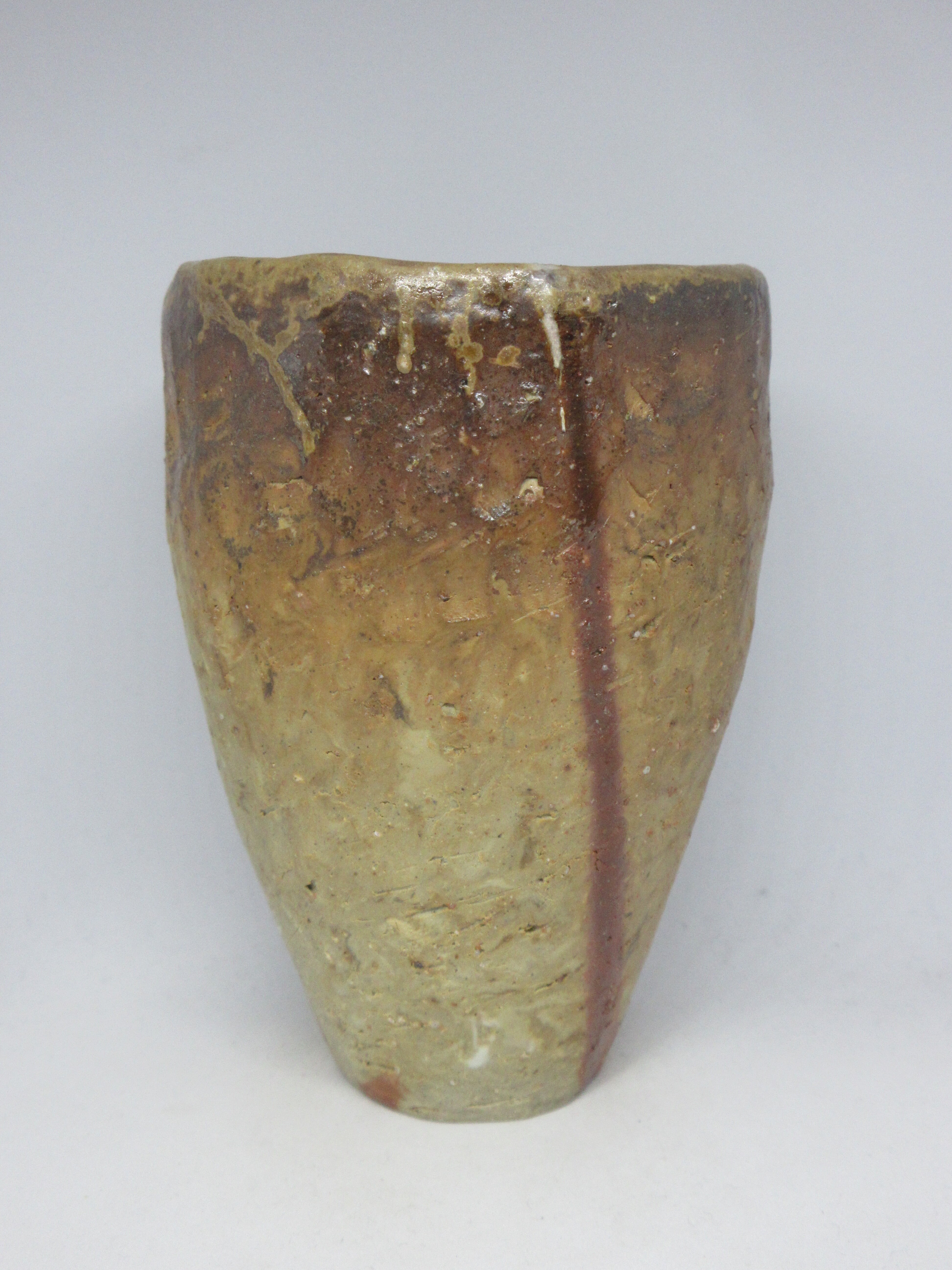 自然練込のビアマグです。白い地肌に緋襷がかかり口縁には胡麻がまわっています。